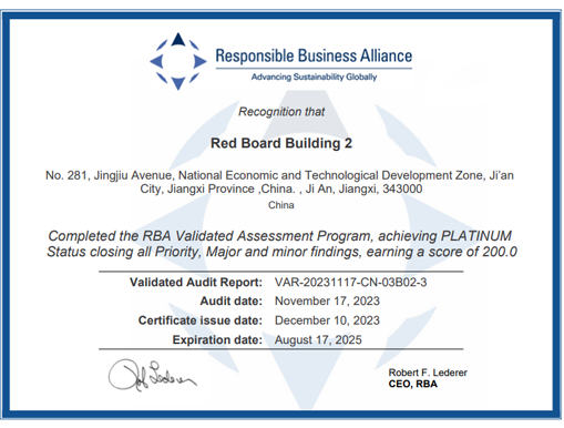 江西必赢76net线路官网股份有限公司于2019年首次获得RBA认证,等级,体现必赢76net线路官网在社会责任方面的重视和付出。必赢76net线路官网承诺会一如既往地满足RBA认证要求,重视社会责任,持续改善在社会责任方面的绩效。